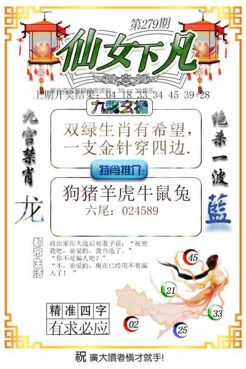279期九龍玄機: 解析:双绿生肖有希望,一支金针穿四边。 特肖推介:狗猪羊虎牛鼠兔 ![]() | |||||||||||||||||||||||||||||||||||||||||||||